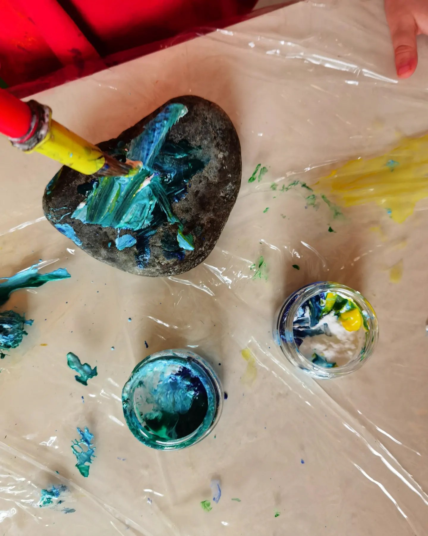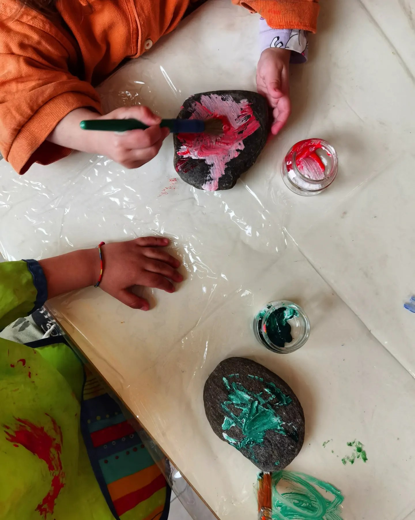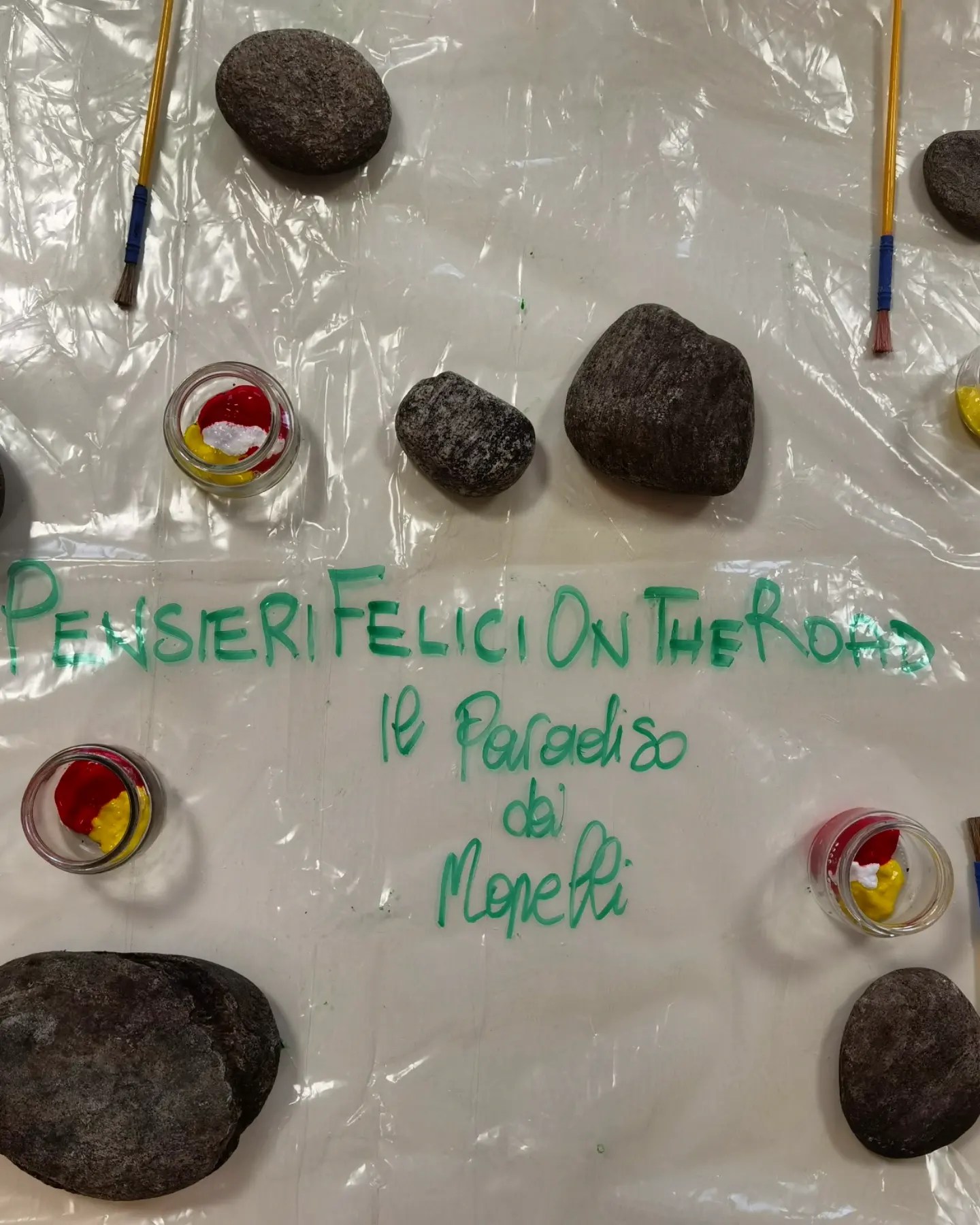 Oggi abbiamo dedicato la mattinata a pitturare questi sassi, per poterli poi spargere per la città e riempirla di colori con i nostri pensieri felici 🌈🎨