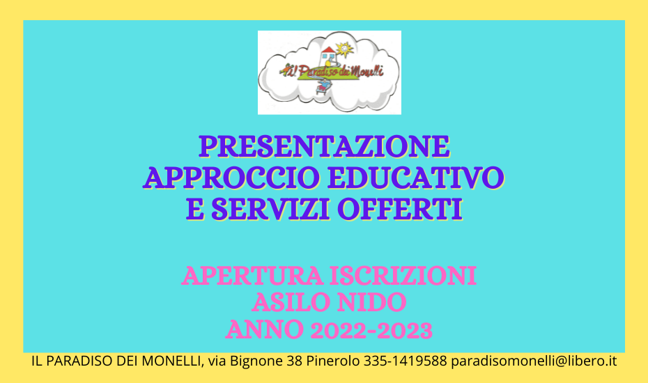 Per chi non fosse riuscito a seguire in diretta è disponibile la registrazione, cliccando sull’immagine sottostante APERTURA ISCRIZIONI ASILO NIDO ANNO 2022-2023 Dal 5 febbraio 2022 sono aperte le iscrizioni per i bimbi che inizieranno a settembre e ottobre 2022, conpilando il seguente modulo.Per chi desidera iniziare dopo, al momento sono aperte solo le pre-iscrizioniContinua a leggere “PRESENTAZIONE APPROCCIO EDUCATIVO E SERVIZI OFFERTI”