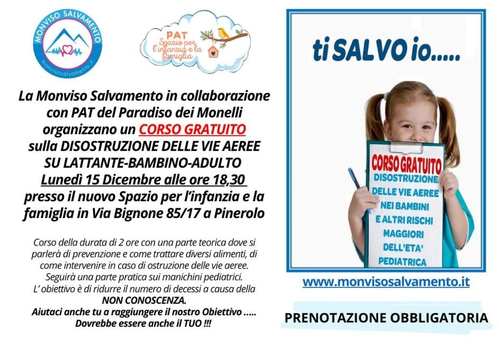 La Monviso Salvamento in collaborazione con PAT del Paradiso dei Monelli organizzano un CORSO GRATUITO sulla DISOSTRUZIONE DELLE VIE AEREE SU LATTANTE-BAMBINO-ADULTO